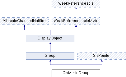 The GlsMimicGroup class provides a way to group objects that change infrequently into a single textured polygon such that performance is increased due to not having to render the objects every frame. Instead, since all of the objects in the group are replaced with a single texture, performance is saved by updating the texture ONLY through handling a display event of name "MimicGroupUpdate". Whenever an object placed in this group is modified, you must write code to emit a "MimicGroupUpdate" ObjectEvent so that any changes made to its appearance will be reflected in the rendered texture.